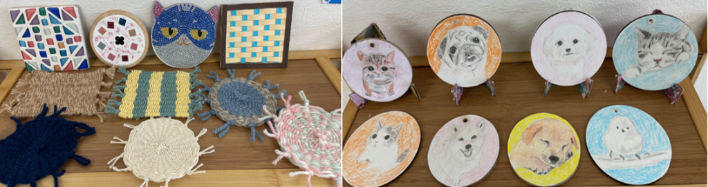 主な活動はパソコンのデータ入力とコースター作りです。パソコンに触った事のない方も、電源の入れ方からマウスの動かし方等、少しずつ練習します。初めての方も今ではデータ入力が出来るようになった方もいらっしゃいます。コースター作りも8月よりスタートし、様々な材料で皆さん楽しんで作業して頂いています。今後も、ものづくりの範囲を広げ、展開していく予定です。お楽しみに♪